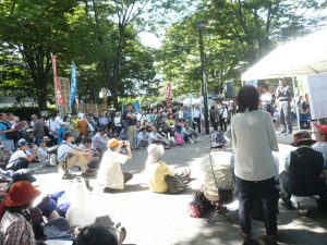 メイン集会の前の2つのサブステージでも、それぞれ原発事故問題や基地問題などについてのトークが行われた。放射能から子どもたちを守ろう関東ネットの木本さゆりさんは、福島原発事故での放射能汚染は関東地方にも及んでいること、その中で子どもたちの健康状態を知るために、医師や市民が連携して「関東子ども健康調査支援基金」を立ち上げ、市民による甲状腺検診を続けていることを報告、賛同をよびかけた。