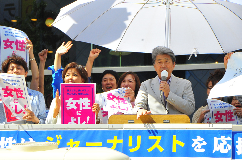 鳥越俊太郎都知事候補の応援にかけつけた、民進党衆議院議員の枝野幸男さん、同じく辻元清美さん、歌手の加藤登紀子さん、共産党参議院議員の吉良佳子さん、上智大学教授の中野晃一さんら。7月29日