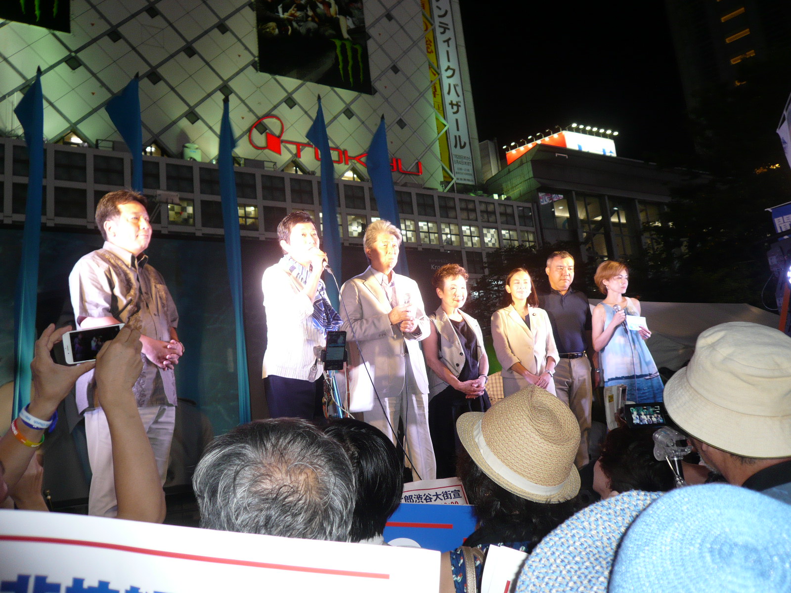 「鳥越俊太郎を応援する市民センター」企画によるこの日の 【7/29(金)女性応援スペシャル 女なら誰でもいいってもんじゃない!鳥越さんを応援する女性・渋谷大集合】に駆けつけた応援弁士は、超党派の女性国会議員らのほか、著名人・女性活動家ら。澤地久枝(作家)、上原公子(元国立市長)、杉浦ひとみ(弁護士)、雨宮処凛(作家)、鎌仲ひとみ(映像作家)、ミサオ・レッドウルフ(首都圏反原発連合)、佐藤かおり(女性と人権全国ネットワーク)・・・ら各氏に加えて、東京・生活者ネットワークの都議会議員・西崎光子(世田谷区)、同じく都議会議員の山内れい子(国立市・国分寺市)も壇上で応援のマイクを握った。