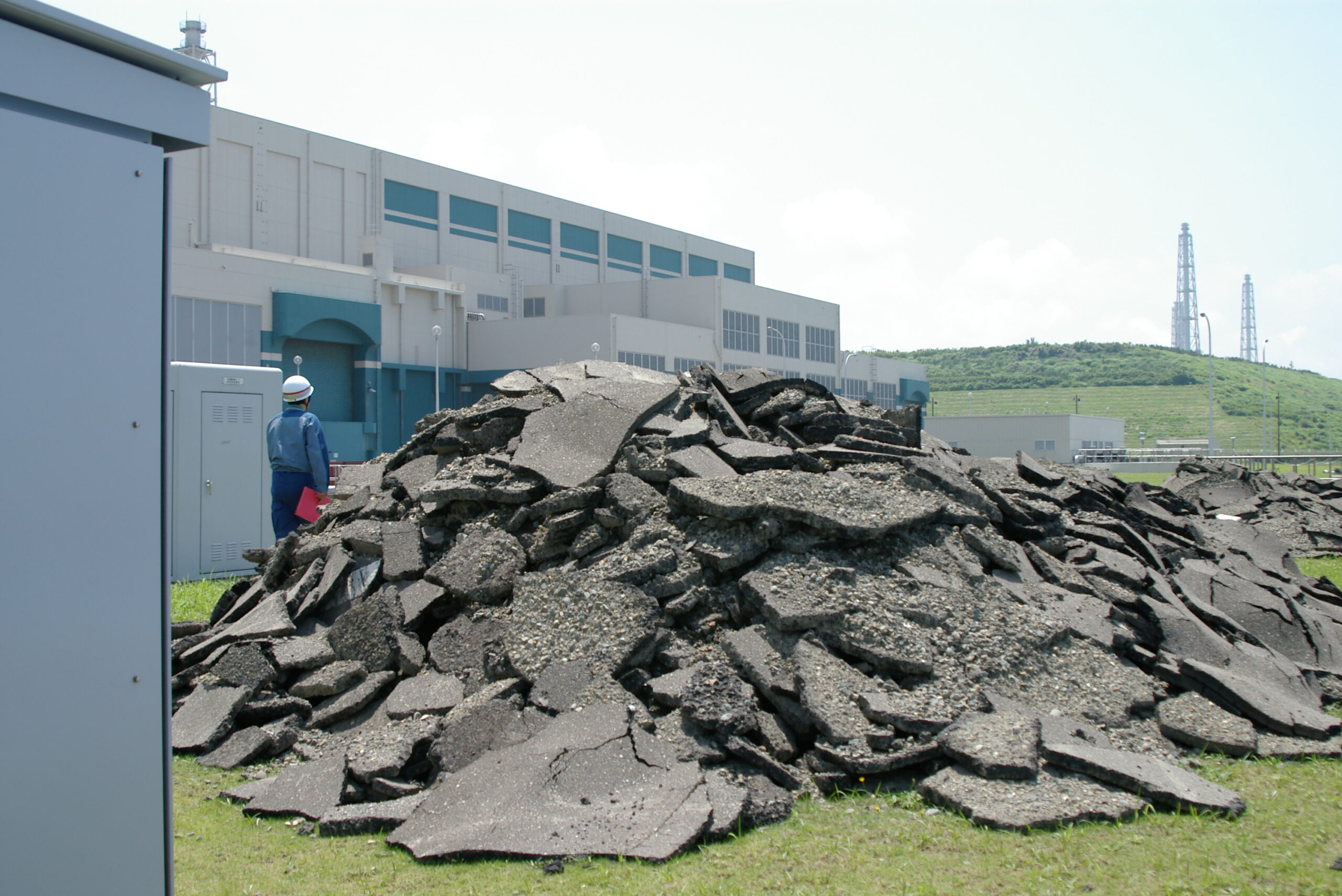 2007年7月16日中越沖地震発生、震度6強の激しい揺れが新潟県の東電・柏崎刈羽原発を襲った。敷地が隆起し、敷地内のアスファルト道路は大きくうねり損壊した。写真は柏崎刈羽原発6、7号機の前に積み上げられたアスファルト道路の残骸(2007年7月27日、田中三彦氏撮影)