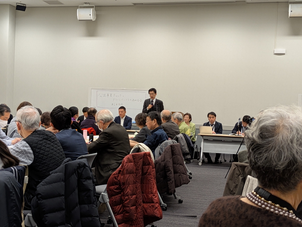 まずは善福寺川上流地下調節池について。当事者を含む市民団体が都の計画に対する国交省の認識を質問、なかでも大西隆さん(東大名誉教授)が指摘したB/C(費用便益比)は、都がこの事業について公表しておらず、試算すると1.0を大きく下回る(つまり、便益よりも費用のほうが高くなる)。この事業に国費を交付することは浪費ではないか、こうしたモラルハザードないし公金濫用を防ぐために交付金の要綱改正が必要ではないか、と提起しました。国交省担当者の答えは、都が示した資料を確認していると、今定められている要綱から1ミリもはみ出さない内容で、「意見があったことは伝える」にとどまりました。
