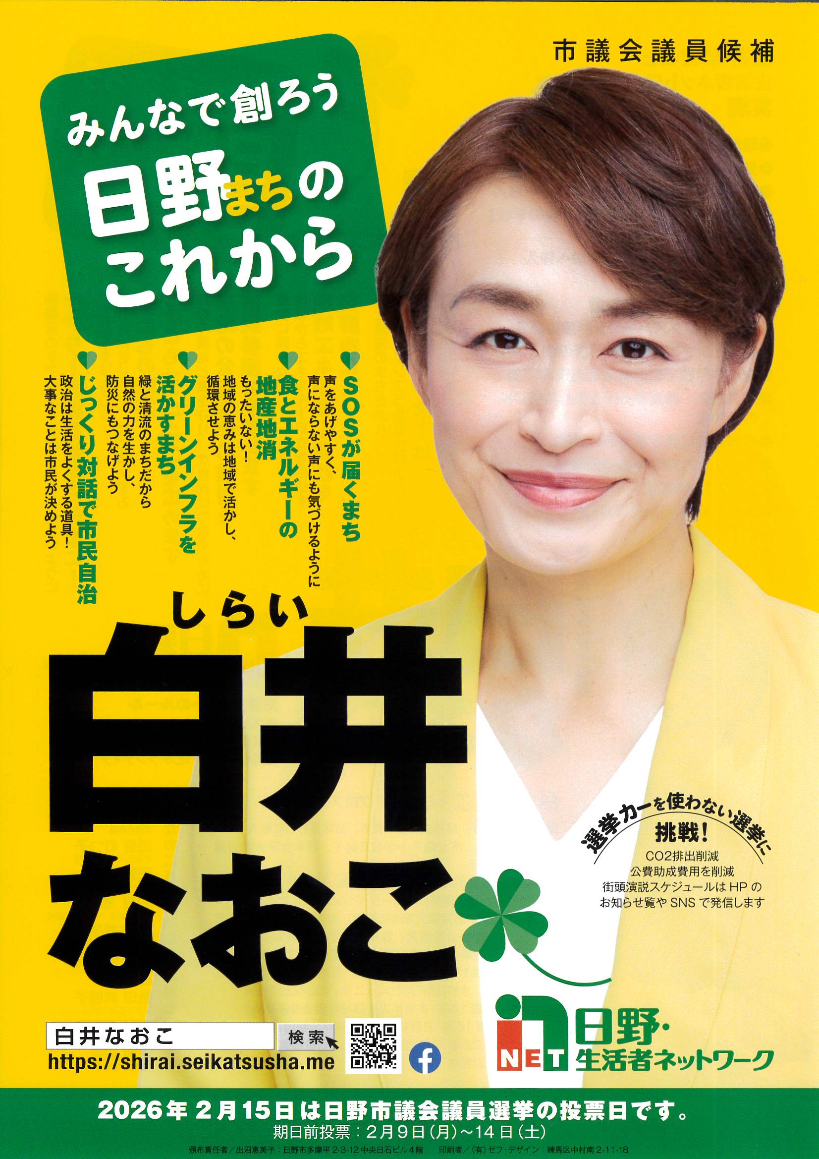 日野市議選! 3期目をめざす、日野・生活者ネット白井なおこが立候補 2026 2/09 トピックス 2月8日告示、15日投票の日野市議会議員選挙に、現職で3期目をめざす、日野・生活者ネットワークの白井なおこが、立候補しました。 白井なおこHP 日野・生活者ネットワークHP 白井なおこ選挙ポスター 白井なおこ選挙運動用ビラ 白井なおこ選挙公報 トピックス URLをコピーしました! URLをコピーしました! 2026衆院選 東京・生活者ネットワーク推薦候補の選挙結果 町田市議選! 2期目をめざす、町田・生活者ネット笹倉みどりが立候補