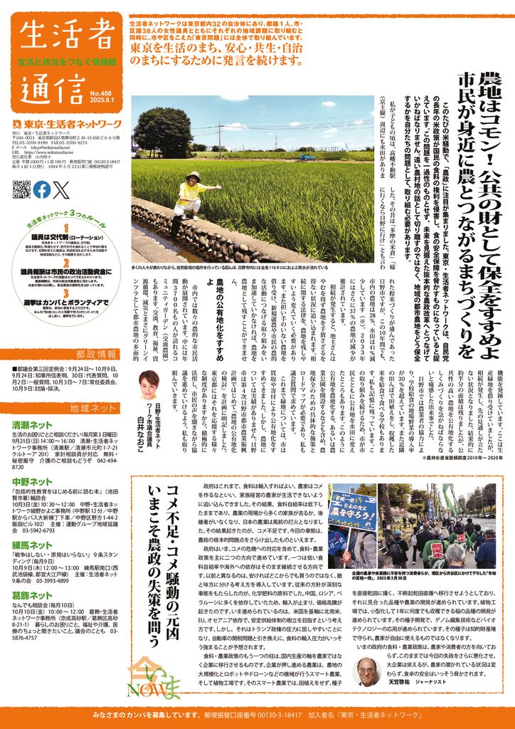 生活者通信 2025年9月号 No.408 生活者通信No.408 2025年9月1日発行 ※画像をタップすると、1ページ、2ページをご覧になれます。 (1面) ◆農地はコモン! 公共の財として保全をすすめよ 市民が身近に農とつながるまちづくりを 農地の公有... -