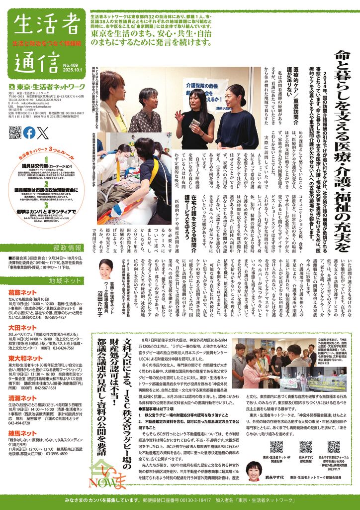 生活者通信 2025年10月号 No.409 生活者通信No.409 2025年10月1日発行 ※画像をタップすると、1ページ、2ページをご覧になれます。 (1面) ◆命と暮らしを支える医療・介護・福祉の充実を 医療的ケア/重度訪問介護が足りない 在宅介護を支える訪... -